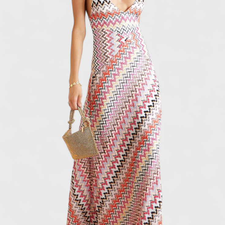 France | Vícebarevné pletené dlouhé šaty s hlubokým výstřihem do V a překříženými zády