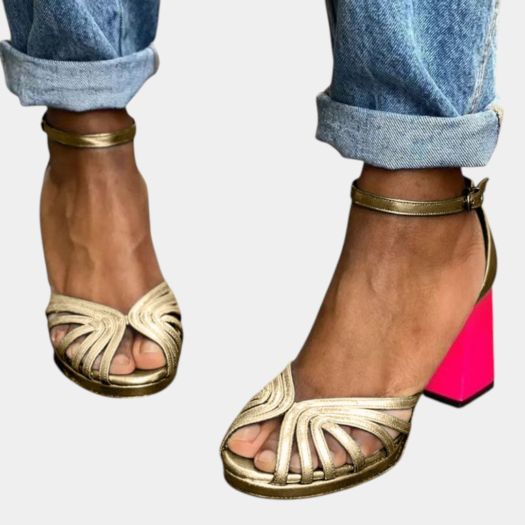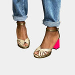 Stylové sandály Harieta dodají vašemu letnímu outfitu šmrnc a eleganci. Zlaté provedení s kontrastním růžovým podpatkem je nepřehlédnutelné a moderní.