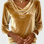 Zazářete s elegancí v tomto zlatém sametovém topu, který spojuje luxusní pohodlí a vytříbený styl. Měkká a lesklá tkanina zvýrazní tón pleti, zatímco elegantní vodopádový výstřih dodává jemný nádech glamouru. Ideální pro večeře, speciální příležitosti nebo pro pozvednutí ležérního outfitu špetkou šarmu.