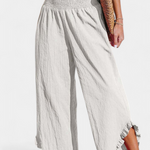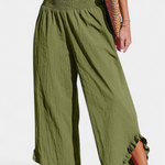 Uvolněné, svěží a plné stylu. Kalhoty Justina kombinují siluetu se širokými nohavicemi s lehkou bavlněno-lněnou tkaninou, ideální pro teplé podnebí. Jejich vysoký, řasený pas lichotí postavě, zatímco volánový lem dodává půvabný a ženský nádech. Všestranný kousek pro plážové outfity, výlety nebo nenucené letní dny.