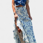 A design with a southern essence that combines femininity and freedom. Karen features a flowing silhouette with a blue floral print on a soft white background, ideal for a day outdoors or achieving a modern bohemian look. The flattering high-waisted cut is complemented by delicate ruffles and a side slit that adds movement and personality.