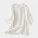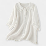 Jemná elegantní košile Jemná elegance s volánky Elegantní pruhovaná košile s límečkem Peter Pan a jemnými volánky, střihem lichotivým pro postavu, pohodlným nošením díky bavlně-lněné směsi a univerzální pro každodenní i slavnostní příležitosti.
