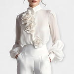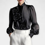 Karolína Sofistikovaná Romantická 3D elegance Tato halenka kombinuje sofistikovaný střih s jemnou, lehce průsvitnou látkou pro elegantní siluetu. Vysoký límec zdůrazňuje strukturu, 3D růže dodávají luxusní, univerzální vzhled vhodný na večer i do kanceláře. Co dělá tento produkt tak výjimečným: Deko