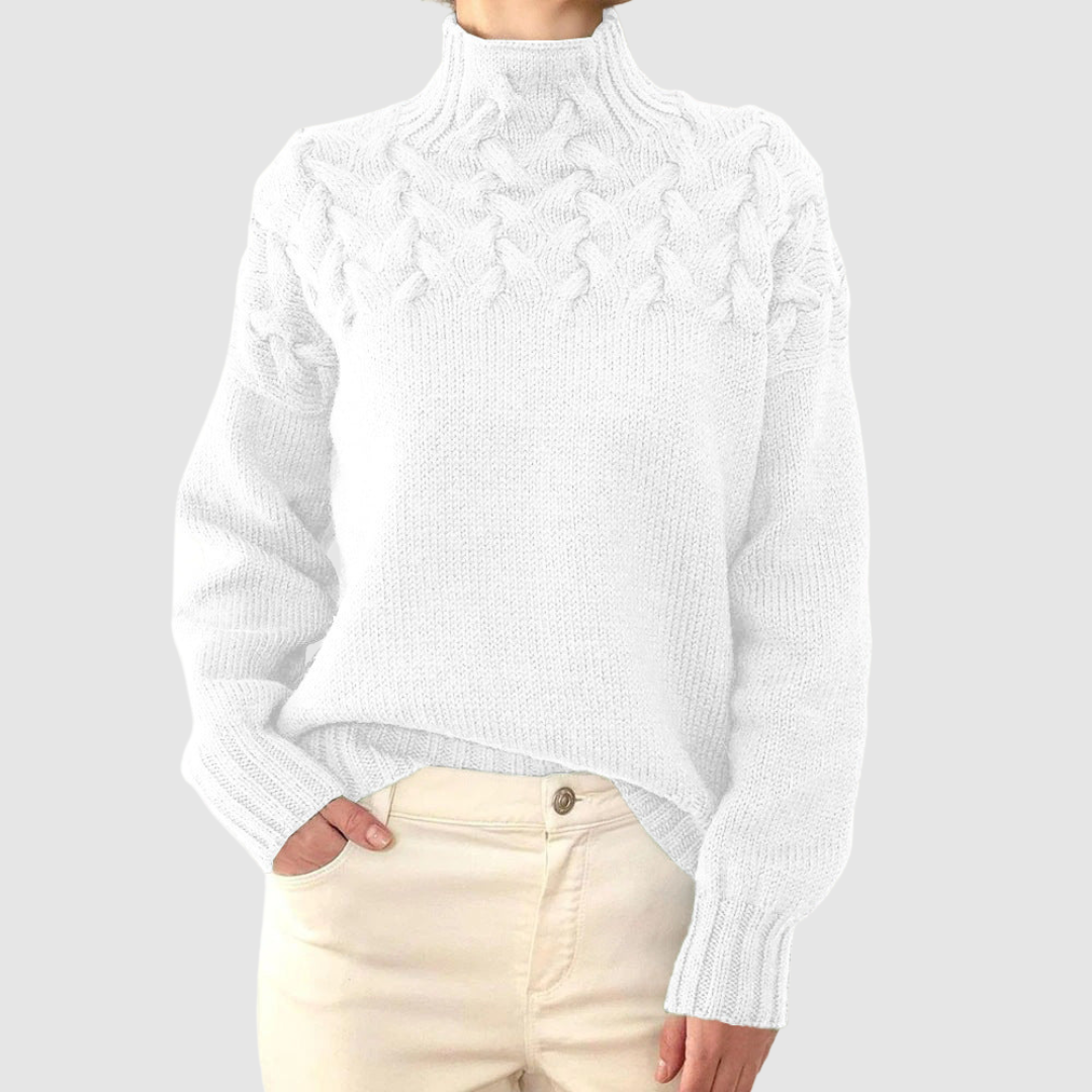 Tento svetr je ideální pro ženy, které hledají spojení elegance a pohodlí. Výrazný pletený vzor v horní části dodává jedinečný vzhled, zatímco vysoký límec chrání před chladem a zajišťuje nadčasový styl.