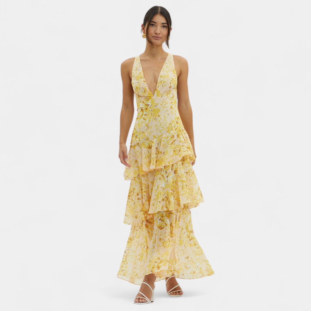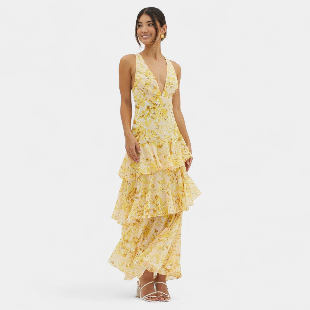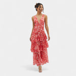 Žofie jsou stylové květované šaty, které oslní svou ženskostí a romantickým designem. Jemný šifonový materiál s květinovým vzorem působí lehce a vzdušně, zatímco vrstvená sukně s volány dodává šatům pohyb a půvab. Výstřih do V krásně zvýrazní dekolt a přidává elegantní nádech. Tyto šaty jsou ideální volbou pro letní oslavy, svatby nebo večerní posezení, kde chcete vypadat šik a sebevědomě.